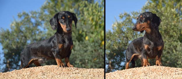 Le Teckel à poil dur conserve la silhouette typique de la race : un corps allongé, des pattes courtes et une musculature bien développée. Son pelage est dense, dur et rêche, avec un sous-poil épais qui le protège du froid et des ronces.